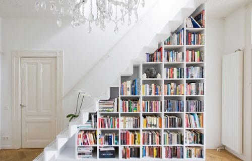 Utrymmet under trappan kan man använda till väldigt många saker. Att ha en bokhylla där skapar nästan en rumkänsla. Eller vad säger ni?