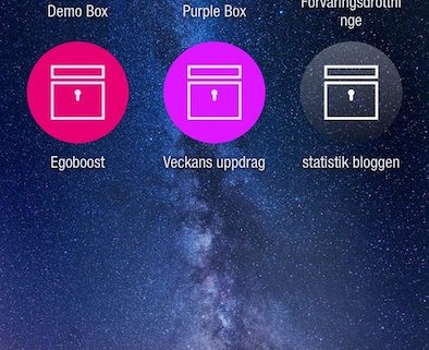 Men eftersom vi får saker skickade till oss i så olika format, så tycker jag att det mest effektiva är att samla all egoboost från olika källor som mail, sms, messeger, facebook, whatsapp, instagram mm på ett och samma ställe. Jag har hittat en app för detta. Den heter Keep it forever. Och vad har den som logga? Jo, en förvaringsbox! För att få in saker där tar jag en skärmbild på det mailet, sms:et eller kommentaren jag vill spara, beskär så att enbart det jag vill ska komma med på bilden, och sparar bilden i appen. Gratisversionen har fem stycken boxar varav en är lösenordskyddad för extra hemliga saker.  Vill du ha fler så får du köpa en prenumeration. En skärmbild på detta ser ut så här: