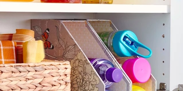 Flera av er har undrat hur man kan förvara just vattenflaskor, som kan vara otympliga. Detta är ett sätt! Ta en (eller flera) dokumenthållare som du har hemma, lägg den på samma sätt som på bilden och stapla flaskorna i den. Klart!