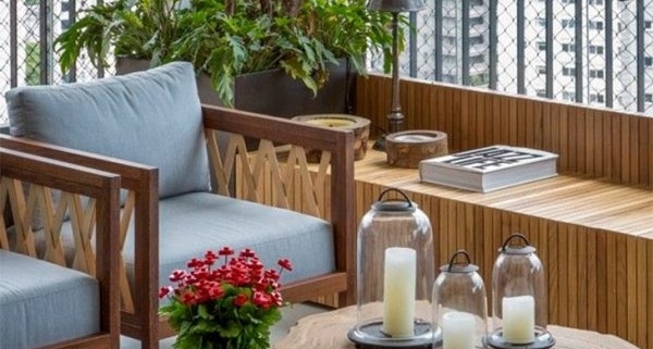 Denna balkong är troligtvis platsbyggd – både väggen och soffgruppen. Träväggen gör den även mer exklusiv.
