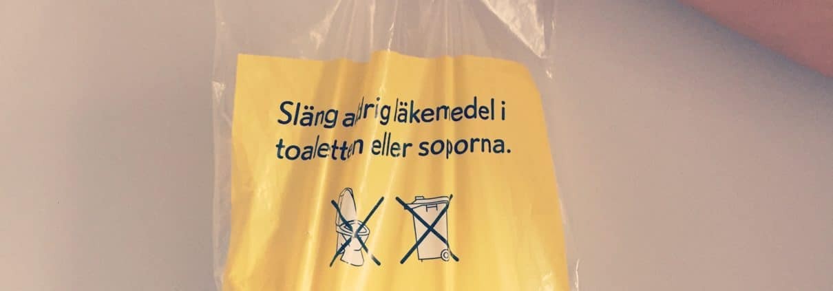 Därefter gäller det att börja rensa bland läkemedlen. Det finns ju bäst-före datum på dem. När ni har gjort det, så återstår en superviktig sak. Läkemedel ska inte kastas i avloppet eller bland hushållsavfall. Detta för att inte förorena naturen och för att det inte ska hamna i orätta händer. Apoteket tillhandahåller en påse avsedd för detta och den ser ut så här: